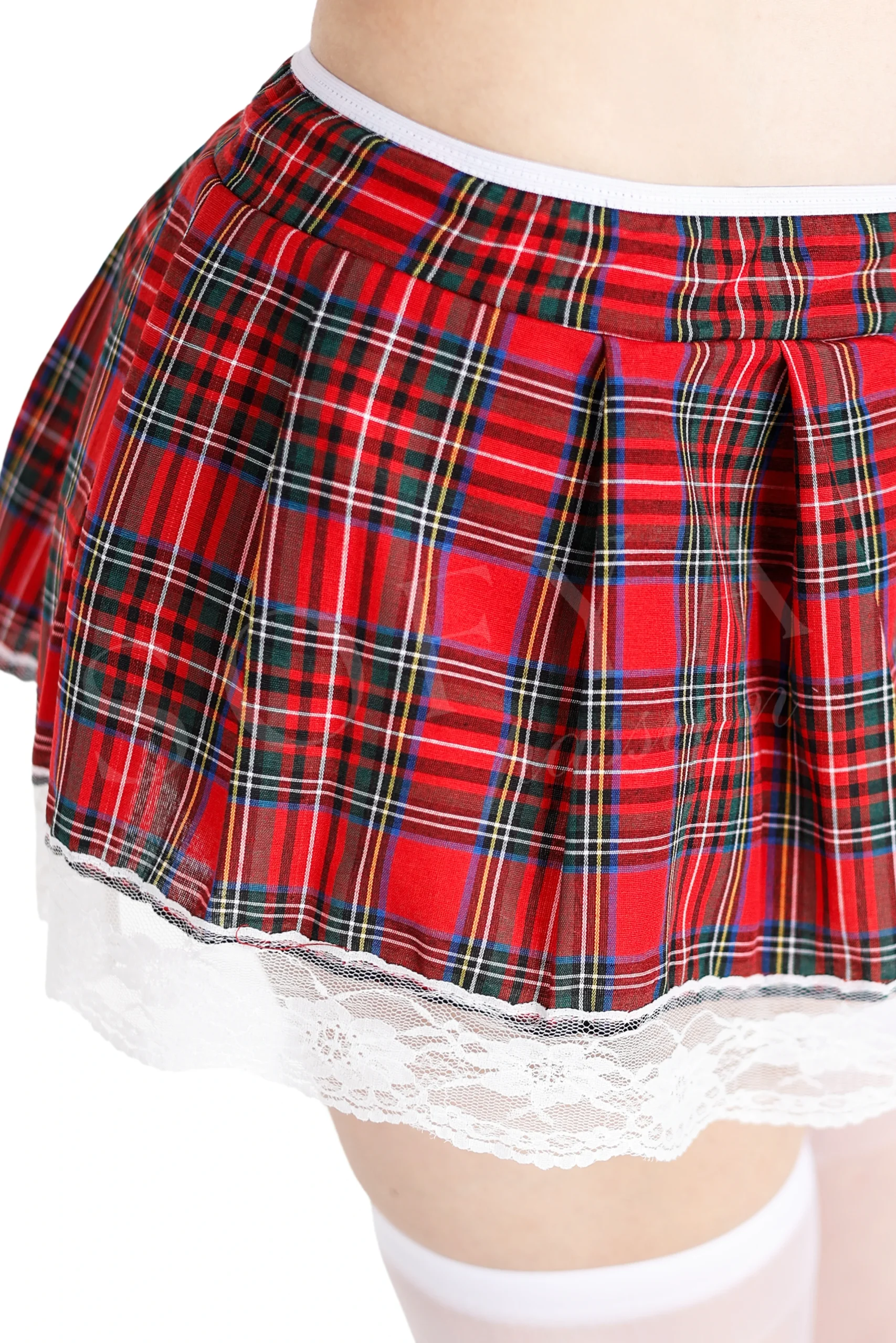 Fantezi gecelik, kadınların en eğlenceli ve şehvetli fantezilerinden birini gerçeğe dönüştüren özel bir tasarımdır. Kırmızı ekose desenli pileli mini etek, dantel uç detayları ve beyaz diz üstü çoraplarla tamamlanan bu takım, hem masumiyet hem de kışkırtıcılığı aynı anda yansıtır.
