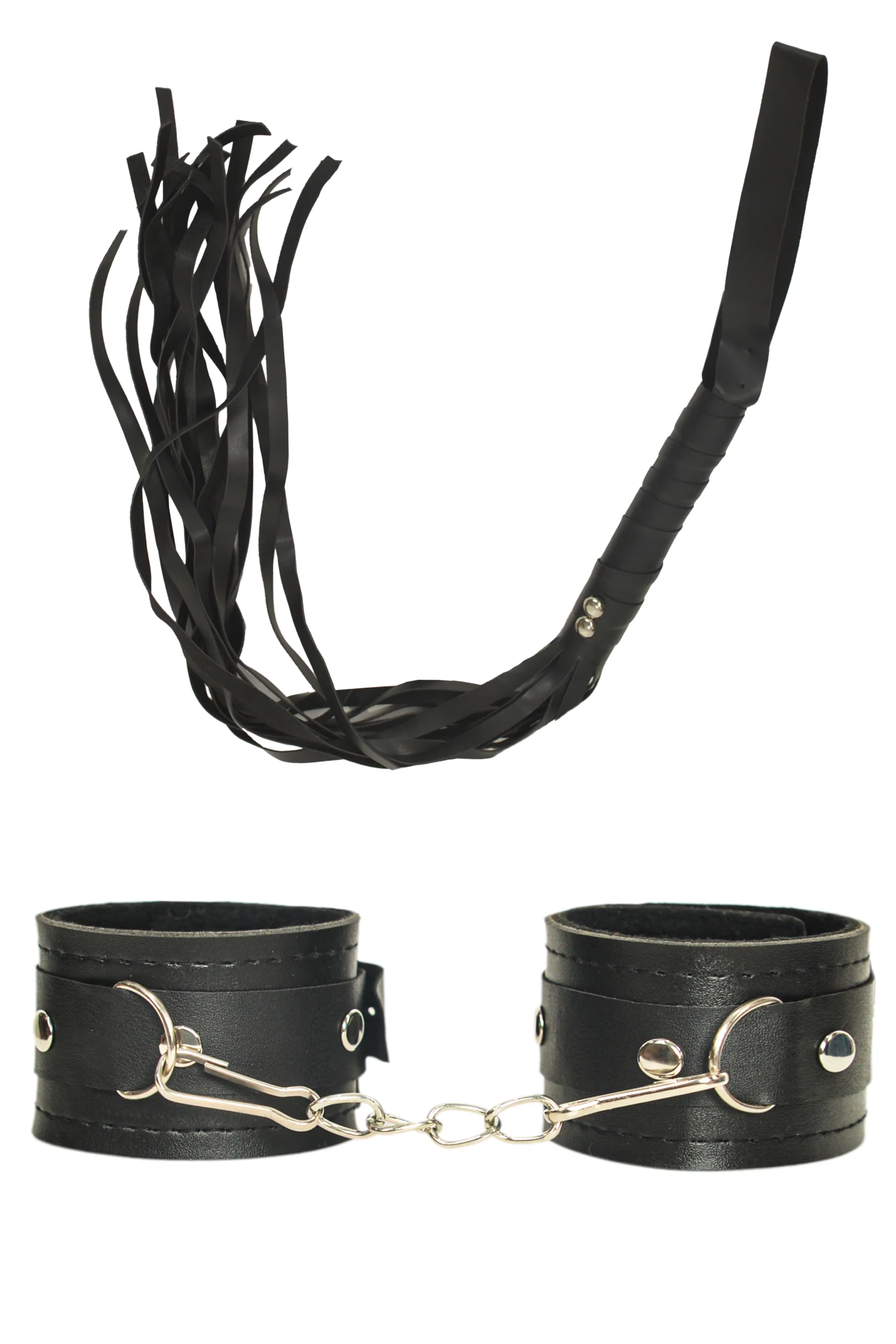 - Fantezi aletleri arasında zamansız bir klasik olan bu siyah deri kırbaç ve kelepçe seti, tutkunuzu stil ile birleştiriyor.