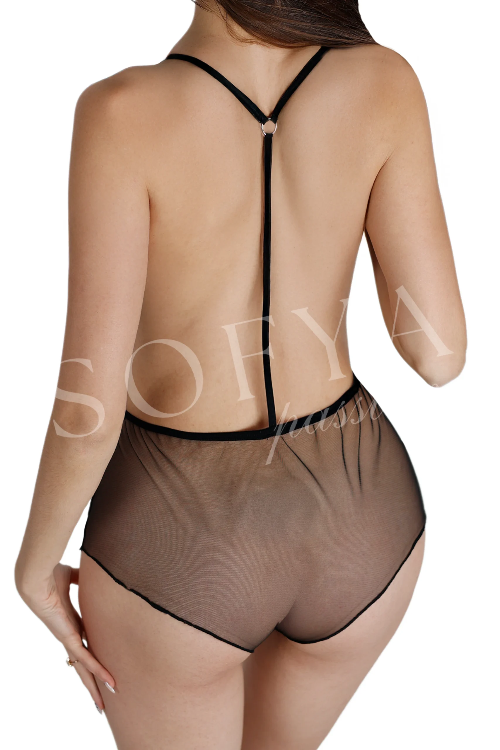 Transparan tül kumaşıyla tasarlanan bu tulum, derin göğüs dekoltesi ve ipli sırt detayı sayesinde şehvetli bir görünüm kazandırır.