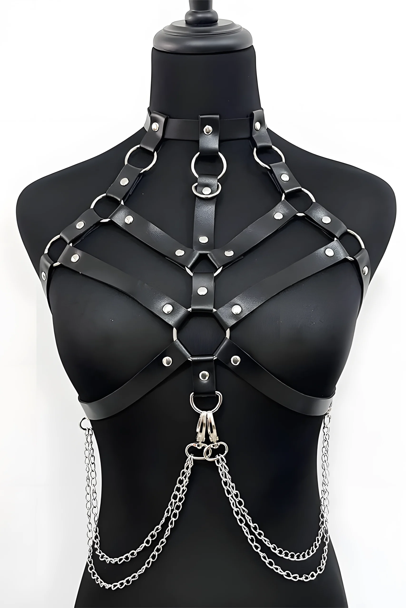 Omuzlardan başlayarak göğüs, bel ve bacaklara kadar uzanan kayış yapısıyla bu harness, vücudu tamamen saran dramatik bir görsellik sunar. Deri ve zincir detaylarıyla birleşerek güçlü ve feminen bir imaj yaratır.