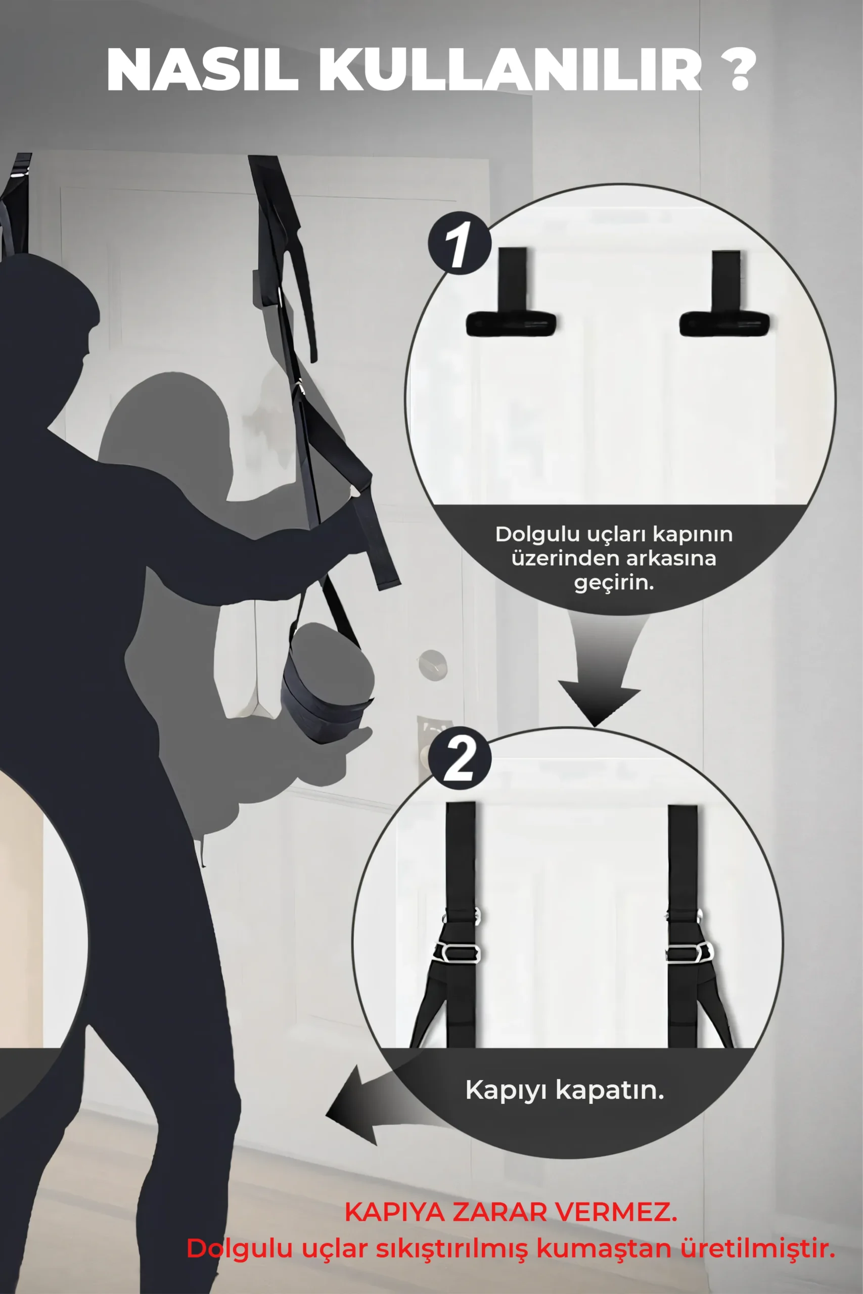 Bu fantezi kapı askısı, herhangi bir kapıya kolayca monte edilebilecek şekilde tasarlanmıştır. Yumuşak yapısı kapıyı deforme etmez. Kullanım için sadece kayışları kapının üst kısmına yerleştirip kapıyı kapatmanız yeterlidir. Kapıya zarar vermeyen ancak sağlam bir tutuş sağlayan sistem, BDSM oyunları sırasında maksimum güvenlik sunar.