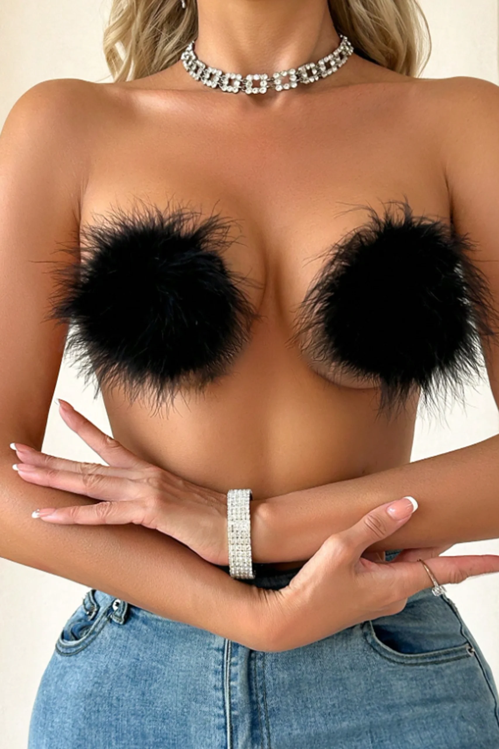 - Özel anlarda dikkat çekici bir görünüm sunan göğüs ucu yapışkanı, yumuşak tüy dokusuyla zarif bir şıklık sağlar.